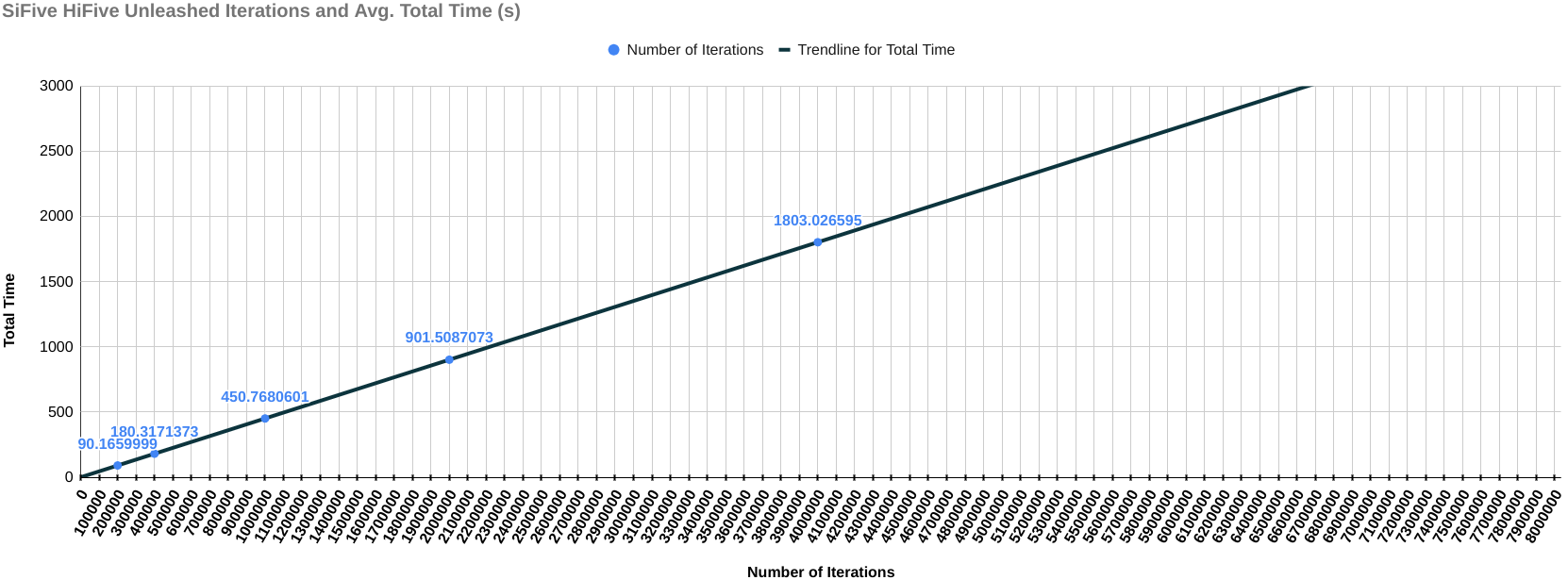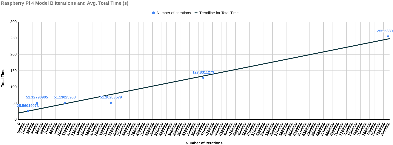 The following results include the final score of each device with the graph of the total time it took for each iteration (on the y-axis) over the number of iterations (on the x-axis). This graph is to check if the change in the amount of time is the same throughout the benchmarking process. If increasing the number of iterations negatively affects the performance of compute instance, then there should be steep curve going upwards indicating that the compute instance is starting to heat up and the performance is degrading, else it will remain a straight line.