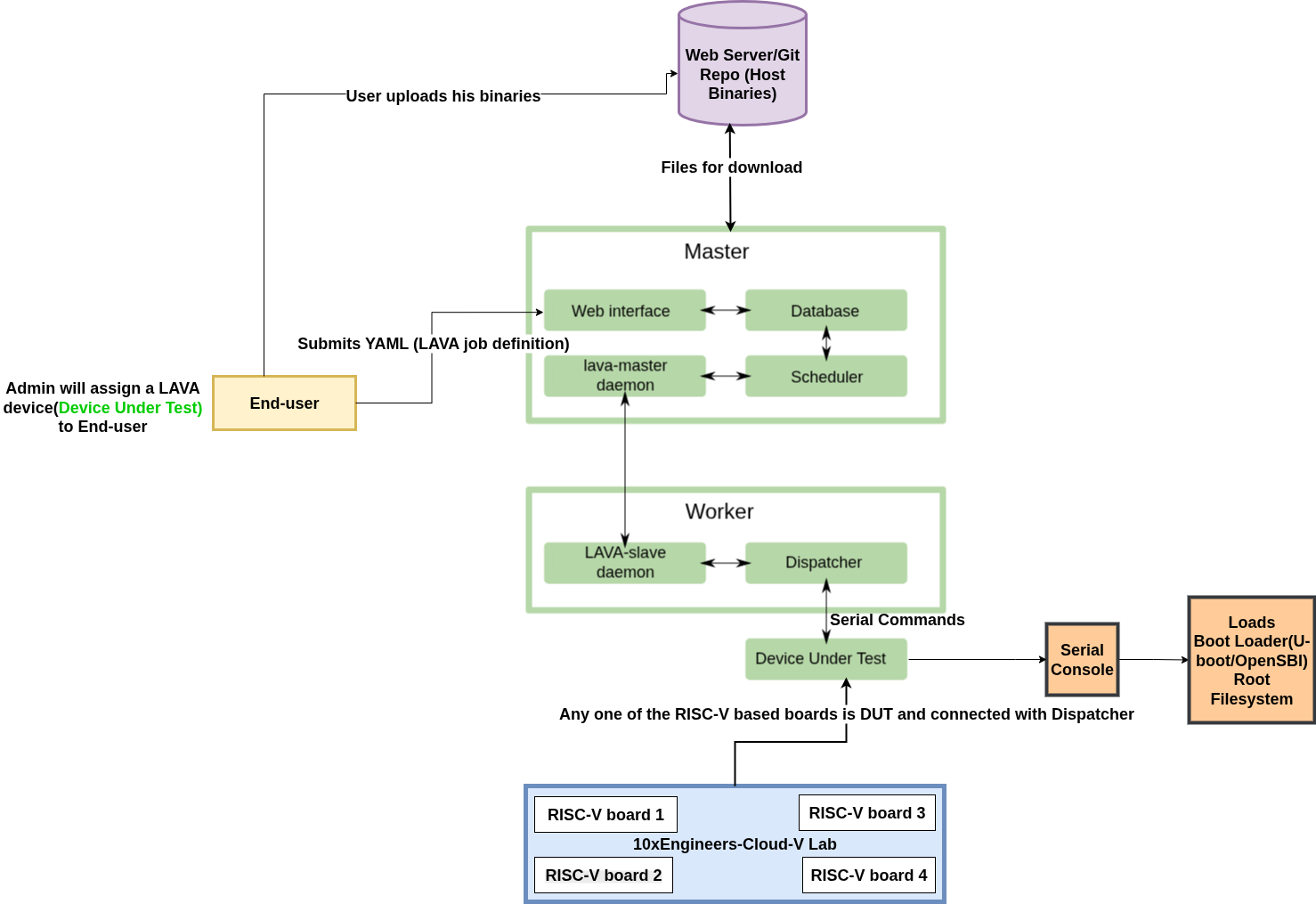 The RISC-V devices in Cloud-V's LAVA lab are connected through an x86 machine that serves as the LAVA master. Users submit their test jobs to this machine using lavacli, which then schedules and runs the tests on the RISC-V hardware boards. The architecture is illustrated in the following diagram.